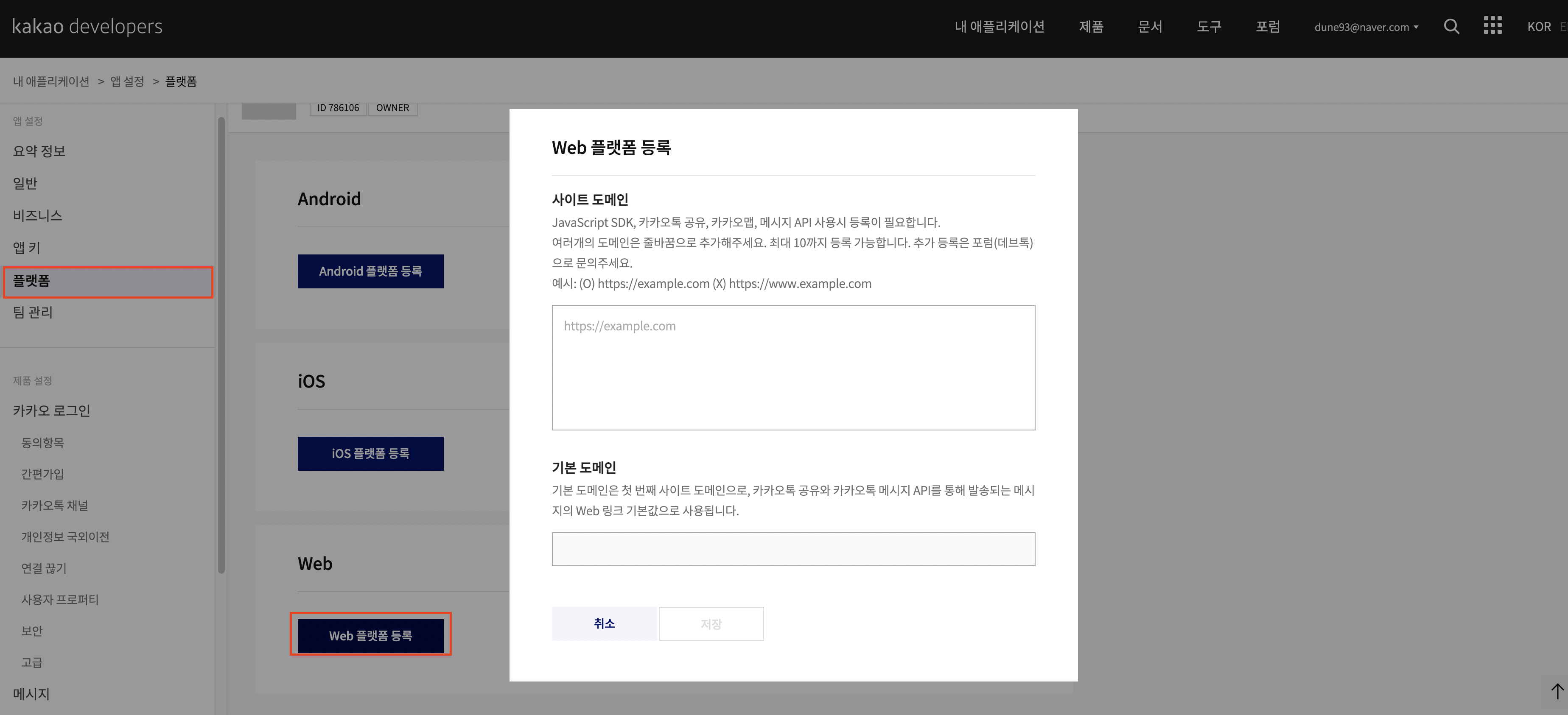 > 내 애플리케이션 -> 앱 설정 -> 플랫폼