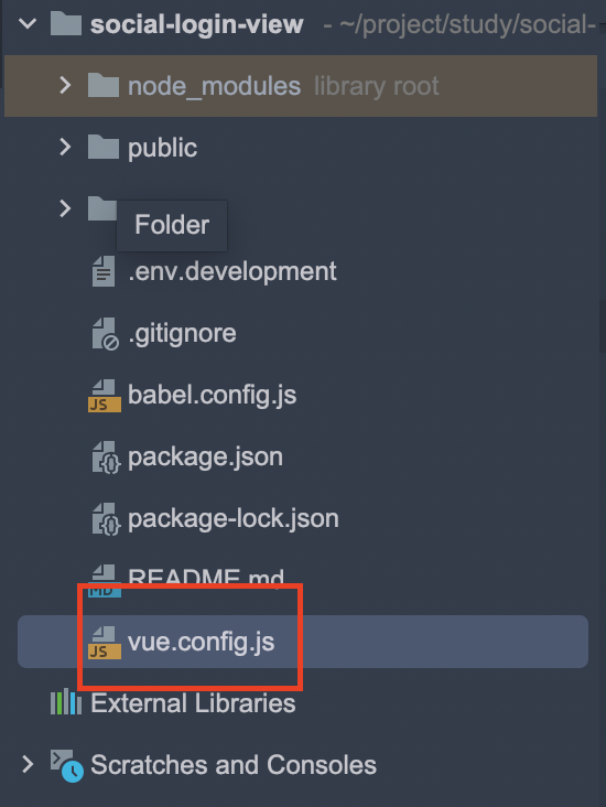 프로젝트 root 경로에 vue.config.js 파일을 생성해준다. package.json 파일과 동일한 경로이다.