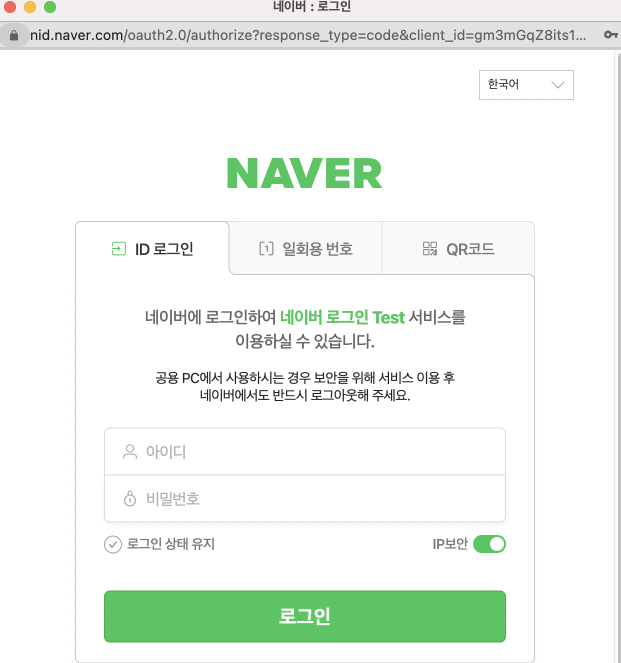 파라미터 요청 값을 올바르게 설정했을 경우 네이버 로그인 페이지가 노출된다.