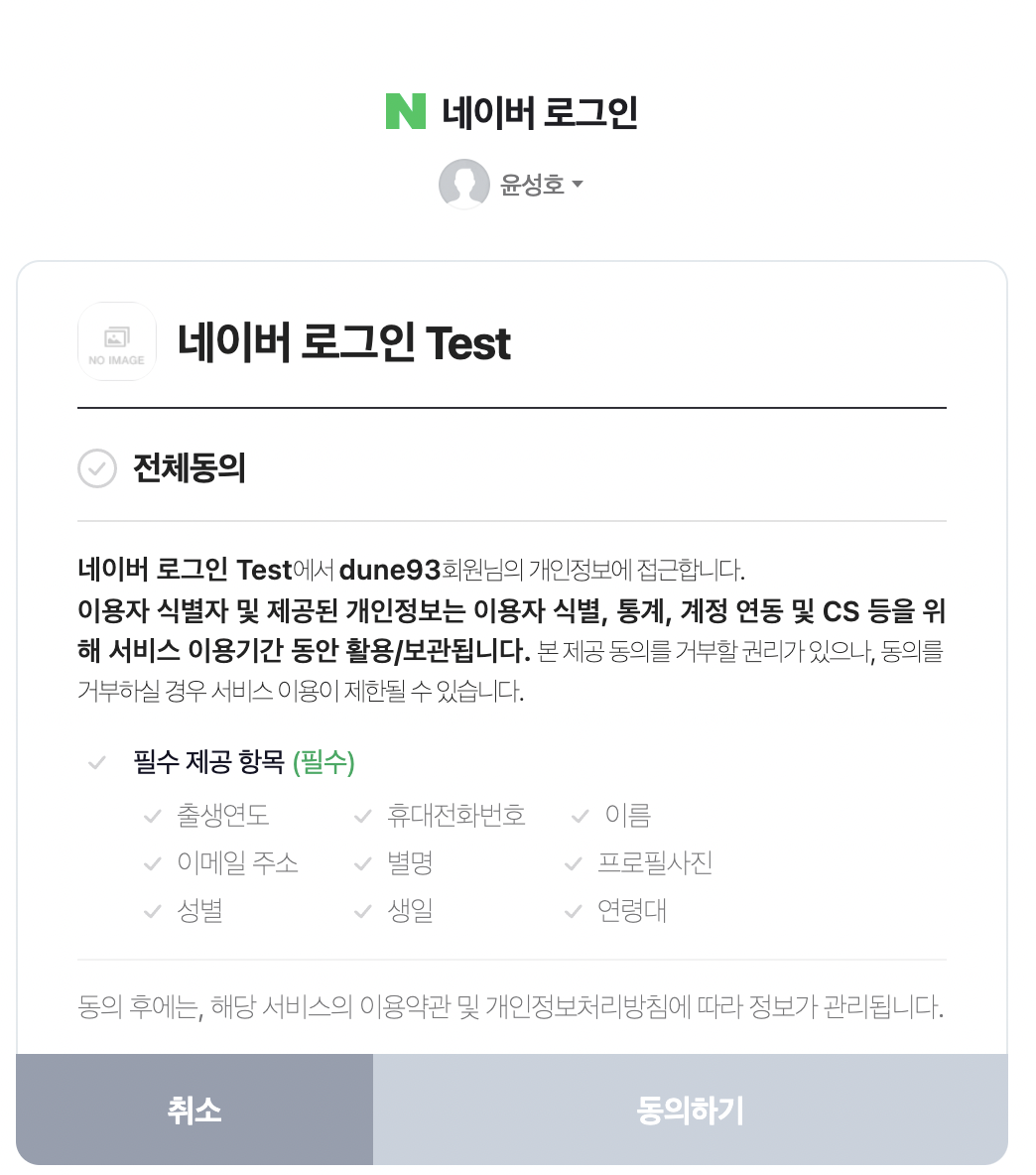 로그인에 성공하면 앞서 설정한 동의 항목이 노출된다.